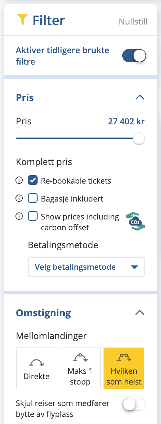 - Flyreiser.no har flere filtre som gjør det raskt og enkelt å sortere og filtrere ut de mest egnede flyreisene.